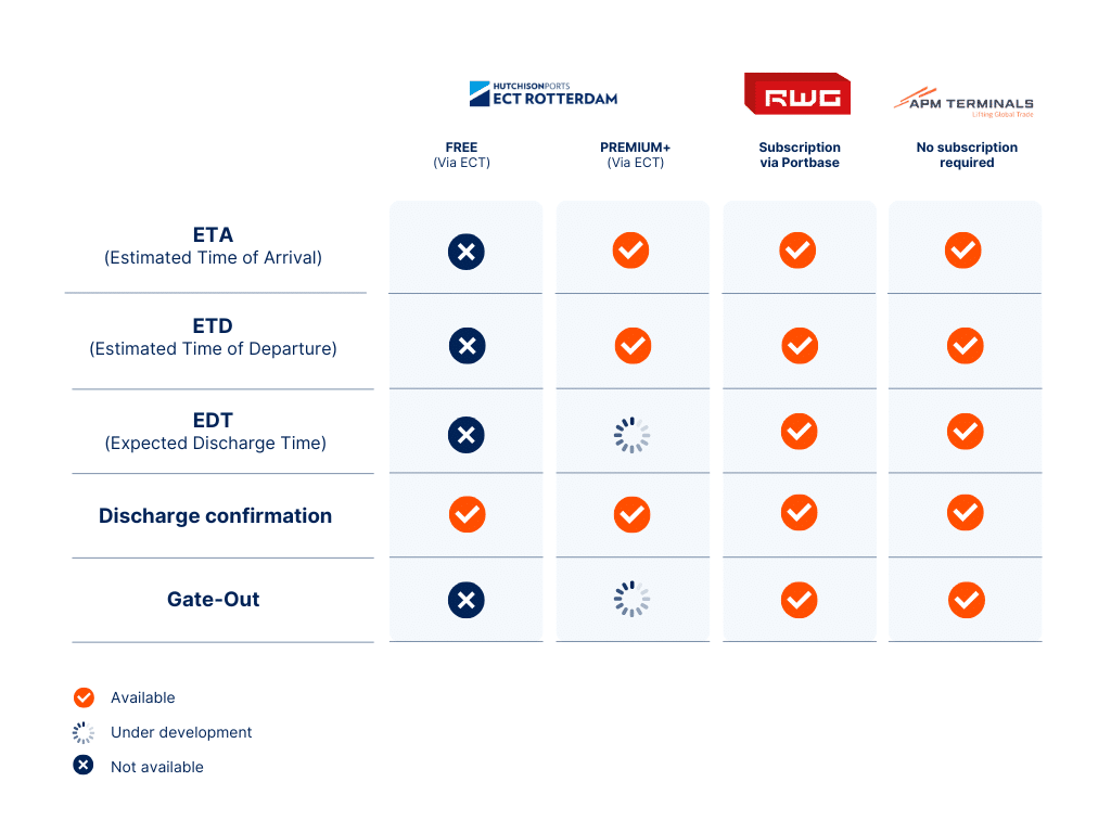 To receive terminal data from ECT, you need to have both a Cargo Contoller account from Portbase and a MyTerminal+ account from ECT. Data authorisations for ECT have to be requested through MyTerminal. More information can be found here.