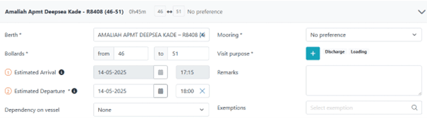 PCS supports you by automatically pre-filling the application using data from your vessel visit. Make sure to submit the application using the ‘Exemptions’ field at the correct berth, so that berth details, ETA and other information are auto-filled correctly.