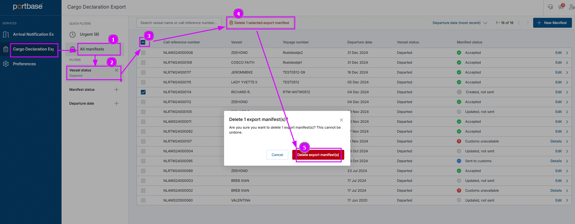 3. A button will appear “Delete [x] selected export manifests” (4). Click on this and confirm with “Delete export manifests” (5).