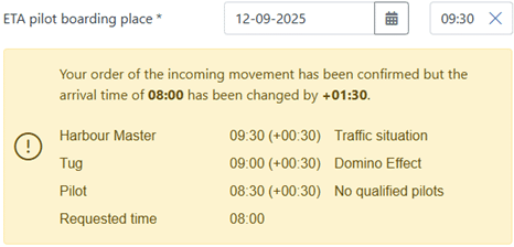 If a service provider’s ETA proposal results in the Harbour Master determining that the proposed time does not fit within the fairway schedule and subsequently issuing a new proposal, the full history will be displayed. The same applies the other way around: if the Harbour Master proposes a time at which, for example, the service providers do not have sufficient capacity available, they may respond with a new proposal.