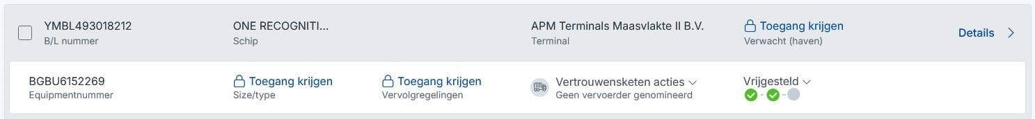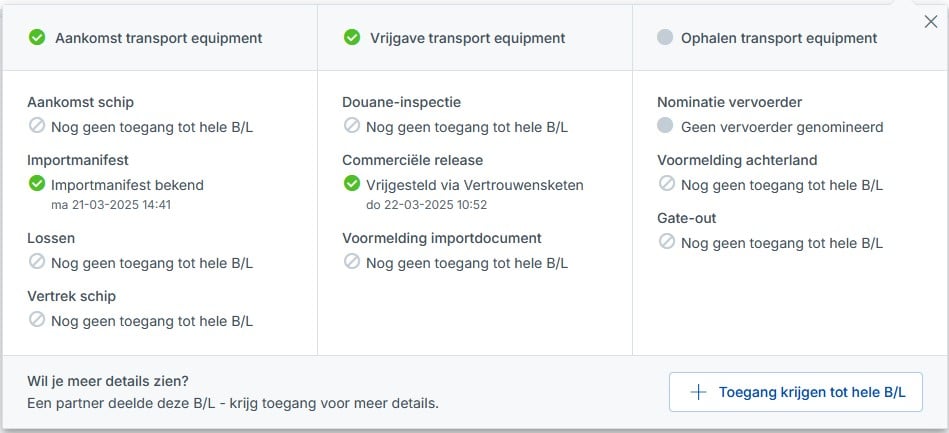 Met Cargo Controller kies je bewust voor de toegevoegde waarde van volledig inzicht, dat wij je aanbieden per betaalde transactie per B/L. De keuze om deze optie actief te laten en te gebruiken, ligt volledig bij je organisatie. Wil je toch liever per B/L een keuze maken voor toegang tot de volledige informatie, dan kan dat ook.Later deze maand volgt meer informatie en de instructie om dit op elk moment aan te passen in je organisatie-instellingen.