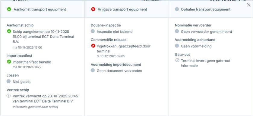 Met de komst van deze nieuwe statussen is het ketenbreed duidelijk wat de oorzaak is en wat je als expediteur/verlader kan doen. zie je de vrijstelling status per container, zie het screenshot hieronder. Wanneer je doorklikt op de status zie je de gedetailleerde status. Een voorbeeld hiervan is te zien in het tweede screenshot.