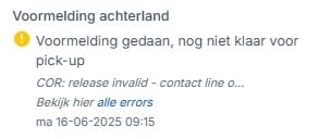 Via de de blauwe link ‘alle errors’ tonen we je meer detail informatie over de voormelding van je vervoerder bij de terminal. Het onderstaande beeld is een zeer uitgebreid voorbeeld en is niet representatief: