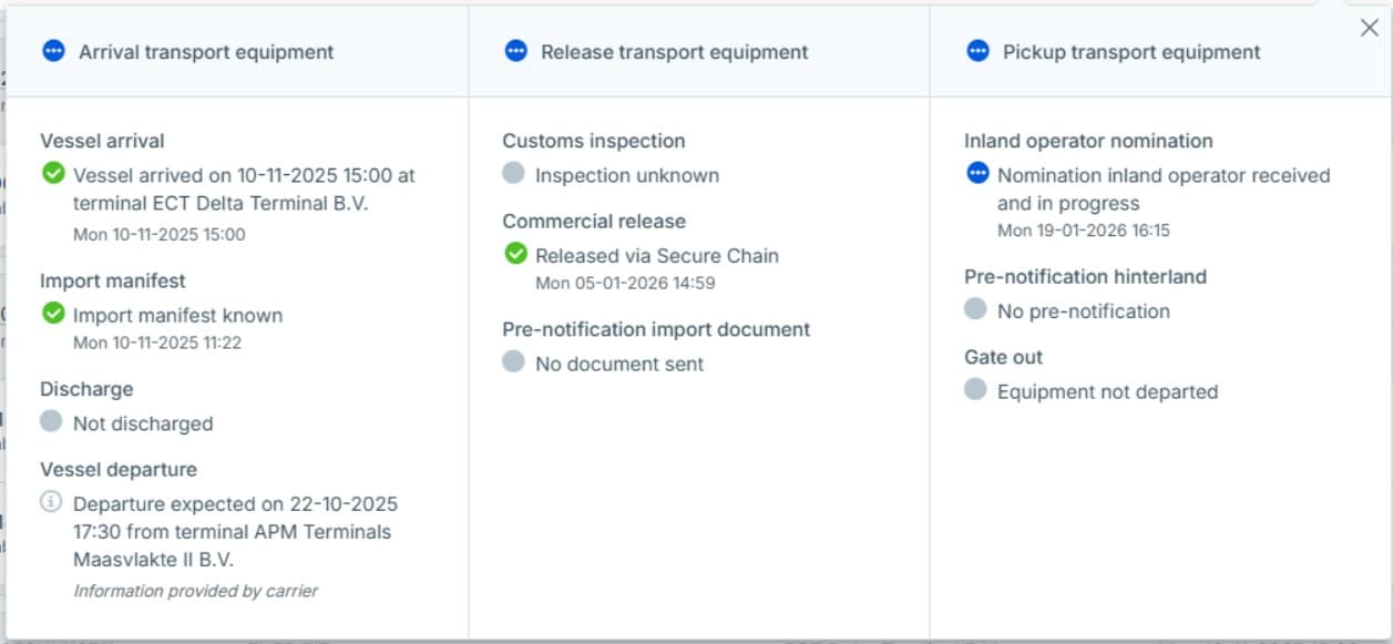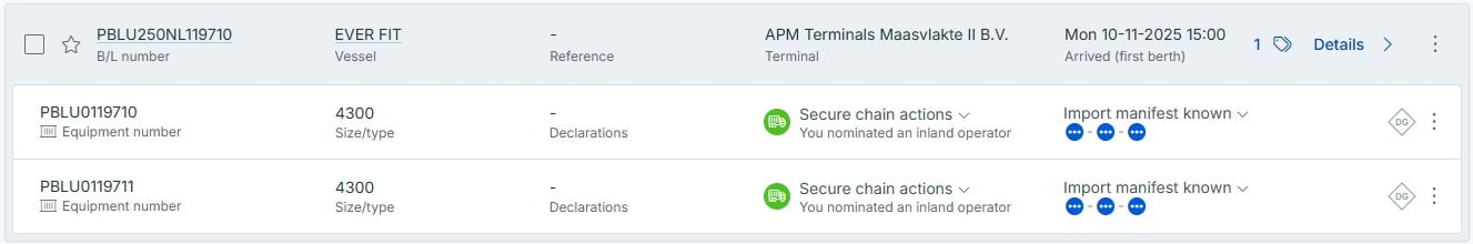 Hieronder in het screenshot zie je de nominatie status per container. Wanneer je doorklikt op de status zie je de gedetailleerde status (het tweede screenshot).