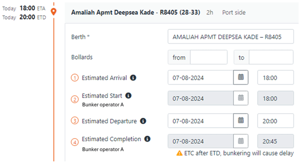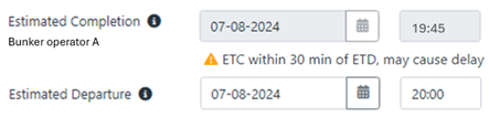 Als de bunkeroperator een ETC invult die nรก het vertrek van het zeeschip ligt, dan krijgt de bunkeroperator een waarschuwing dat hij voor vertraging zorgt.
